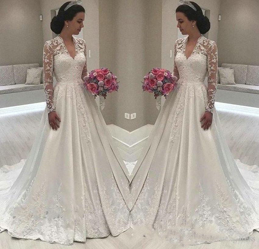 Compre Tela De Raso Vestidos De Novia De Encaje 2020 Mas Nuevo Longitud Profundo Cuello En V Piso De Boda Vestido Imponente Acanalada Vestidos De Novia Vestido De Noiva A 139 02
